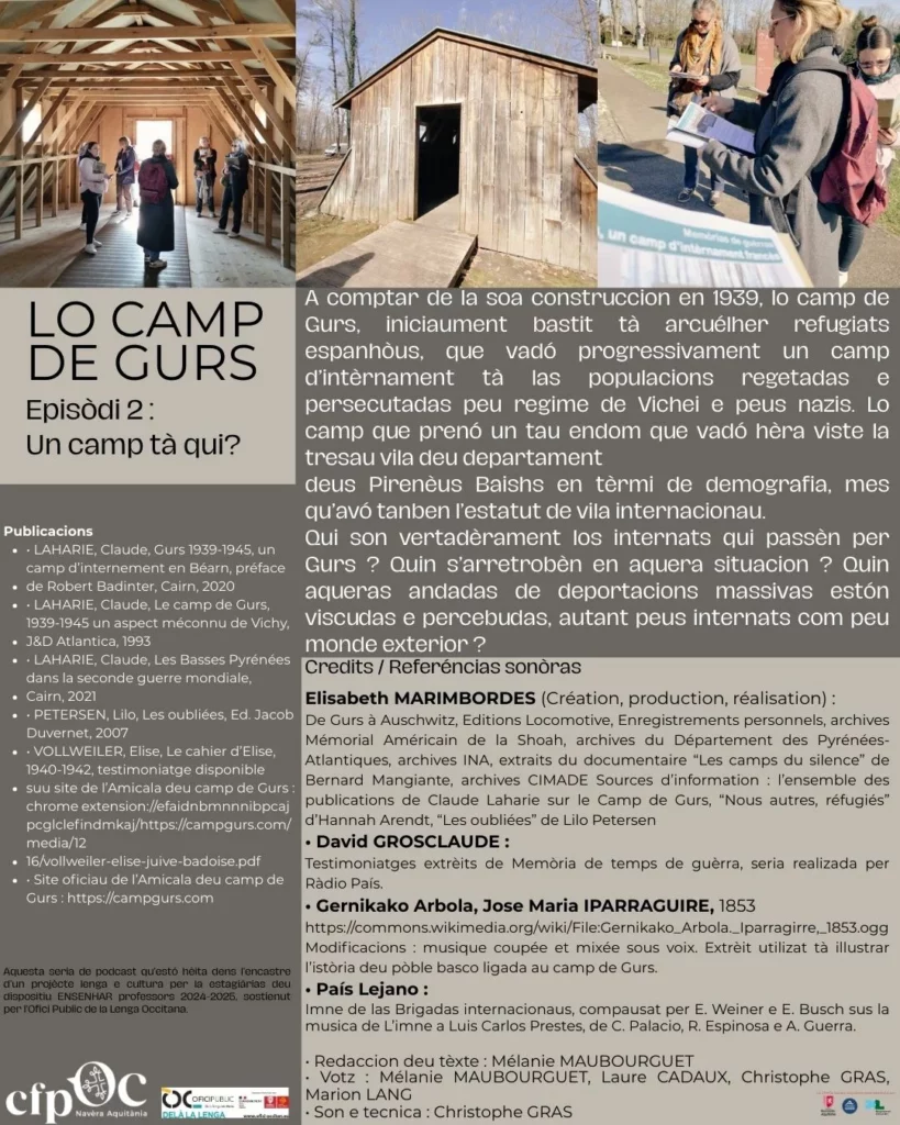 Nous vous proposons le deuxième épisode des enregistrements sur le Camp de Gurs qui vous parle des personnes qui y ont été enfermées. Pour l’écouter, suivez ce lien : https://cfpoc.com/wp-content/uploads/2026/03/podcast-camp-de-gurs-ep2.mp3