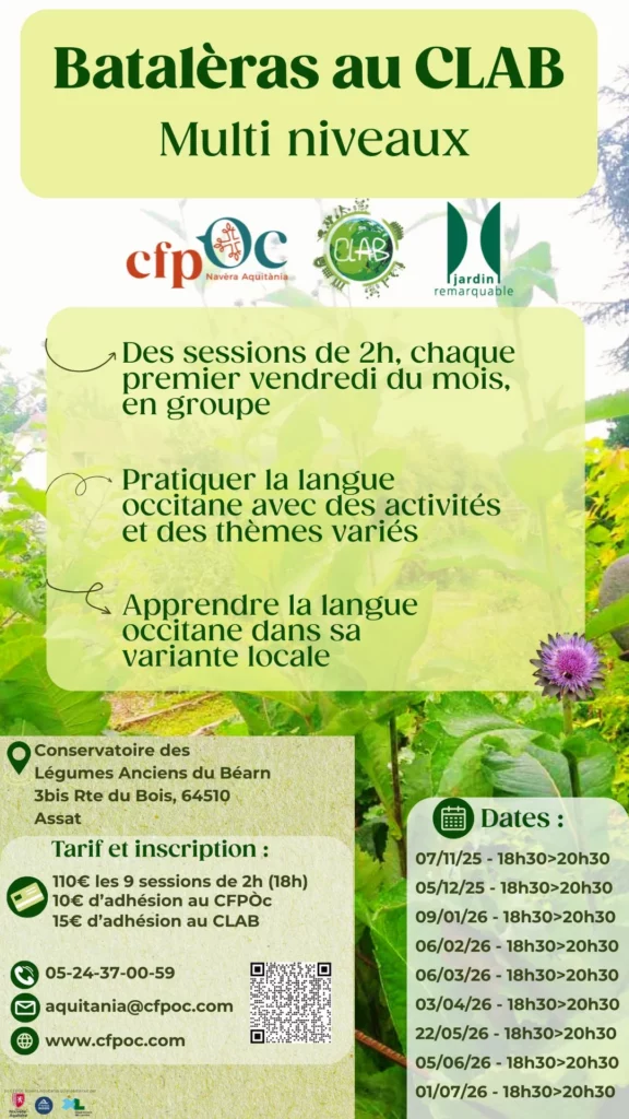 Incriptions : https://www.helloasso.com/associations/cfpoc-nouvelle-aquitaine/adhesions/inscription-batalera-assat-un-cop-per-mes-2025-2026-2 – en nous contactant ou en venant nous rencontrer le 07/11 !