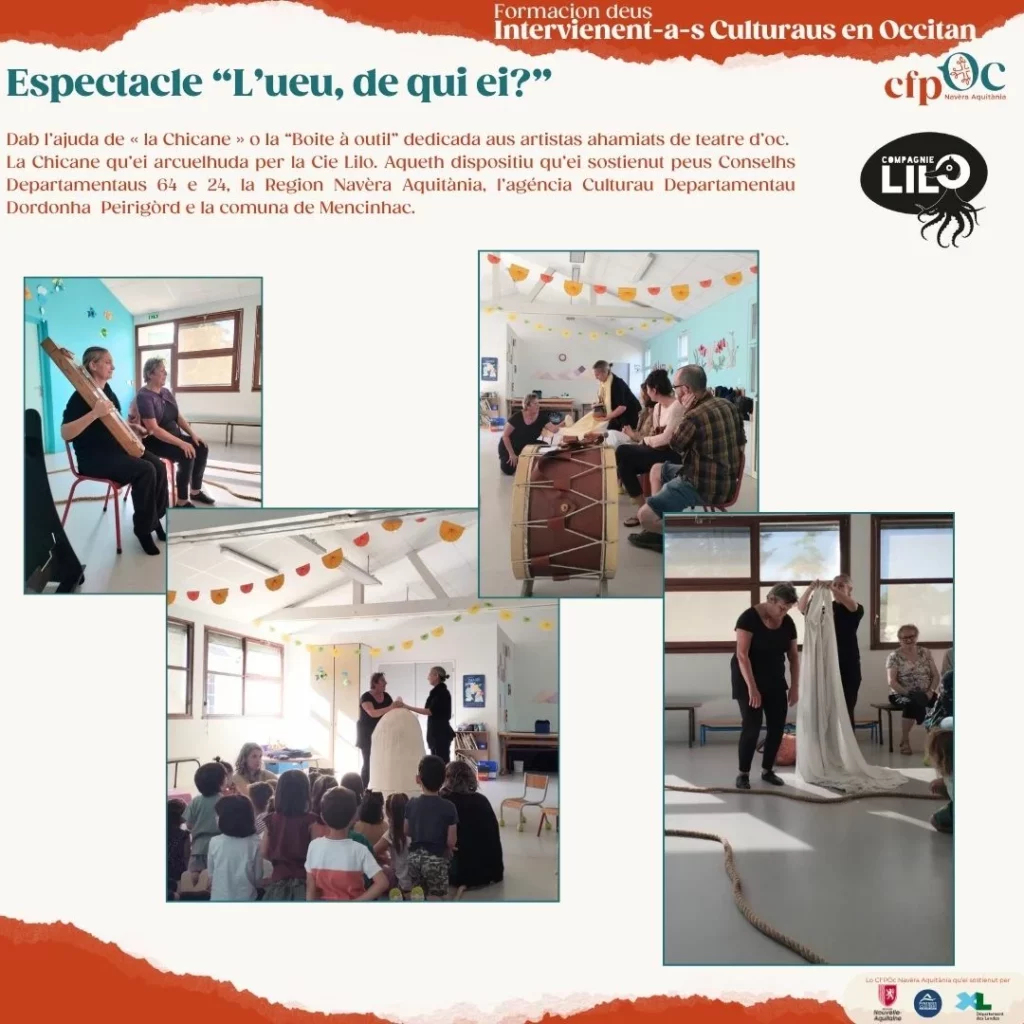 Yolande Cazenave, Anne-Lise Herbel que perpausan l’espectacle « L’ueu de qui ei », hicat en scèna per Laurenç Labadie dab ua scenografia de Marie Baudoin. Que s’encontrèn au parat de la formacion deus Intervienents Culturaus en Occitan deu CFPÒc Navèra Aquitània.