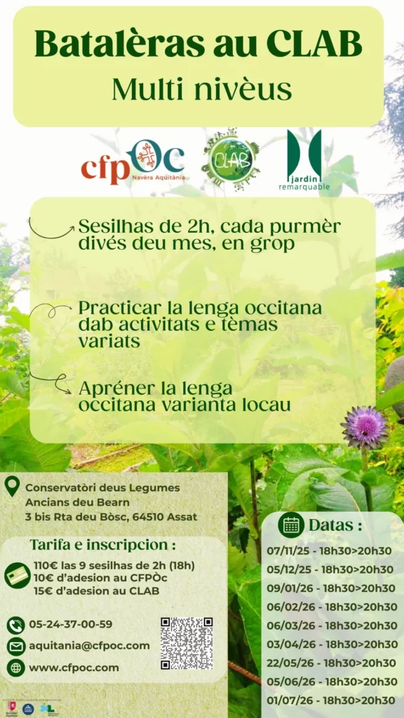 Inscripcions : https://www.helloasso.com/associations/cfpoc-nouvelle-aquitaine/adhesions/inscription-batalera-assat-un-cop-per-mes-2025-2026-2 – en nse contactar o en viéner encontrà’ns lo 07/11 !